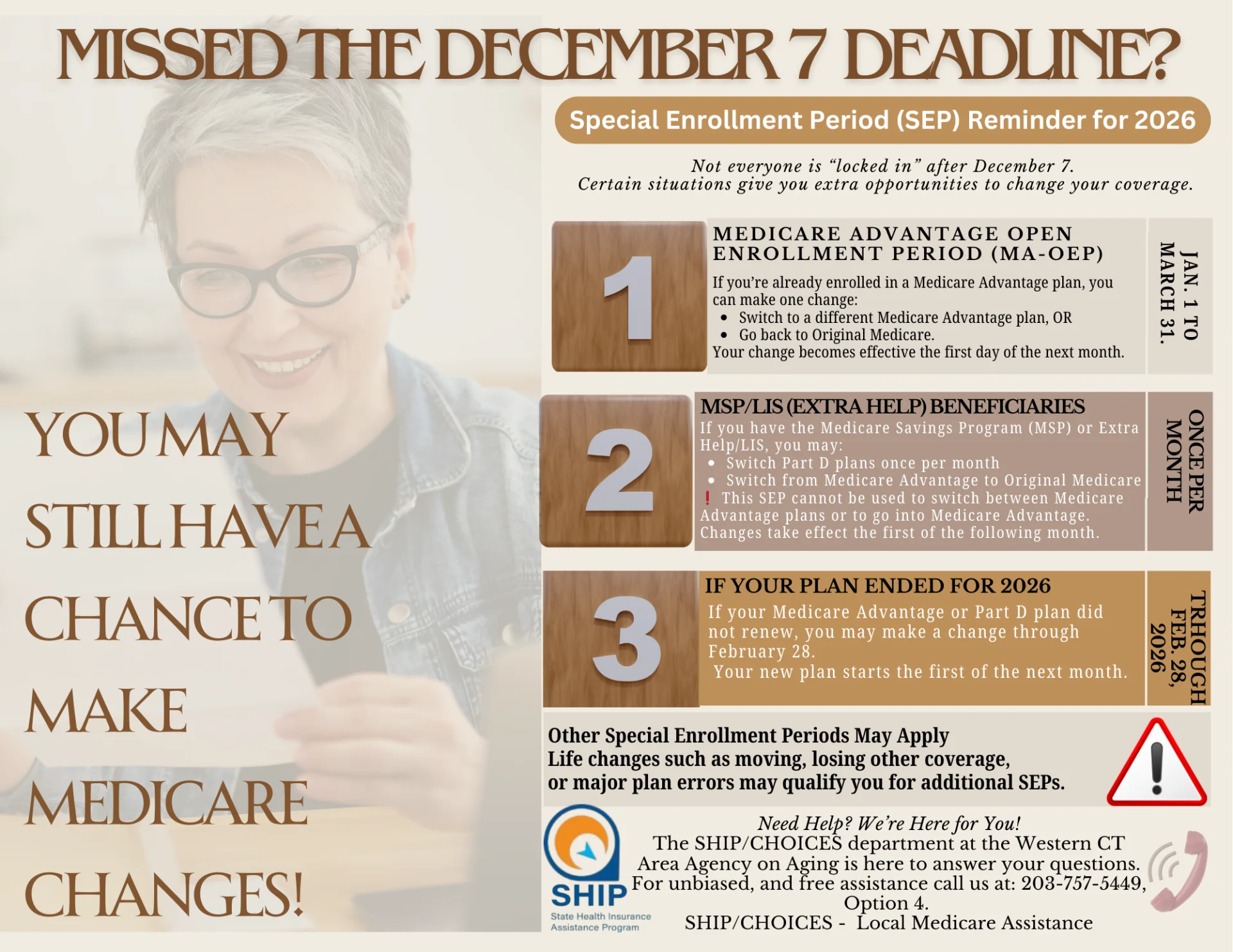 If you missed the December 7 Medicare Open Enrollment deadline, you may still have options through a Special Enrollment Period. Call SHIP/CHOICES at 203-757-5449, Option 4, for guidance.