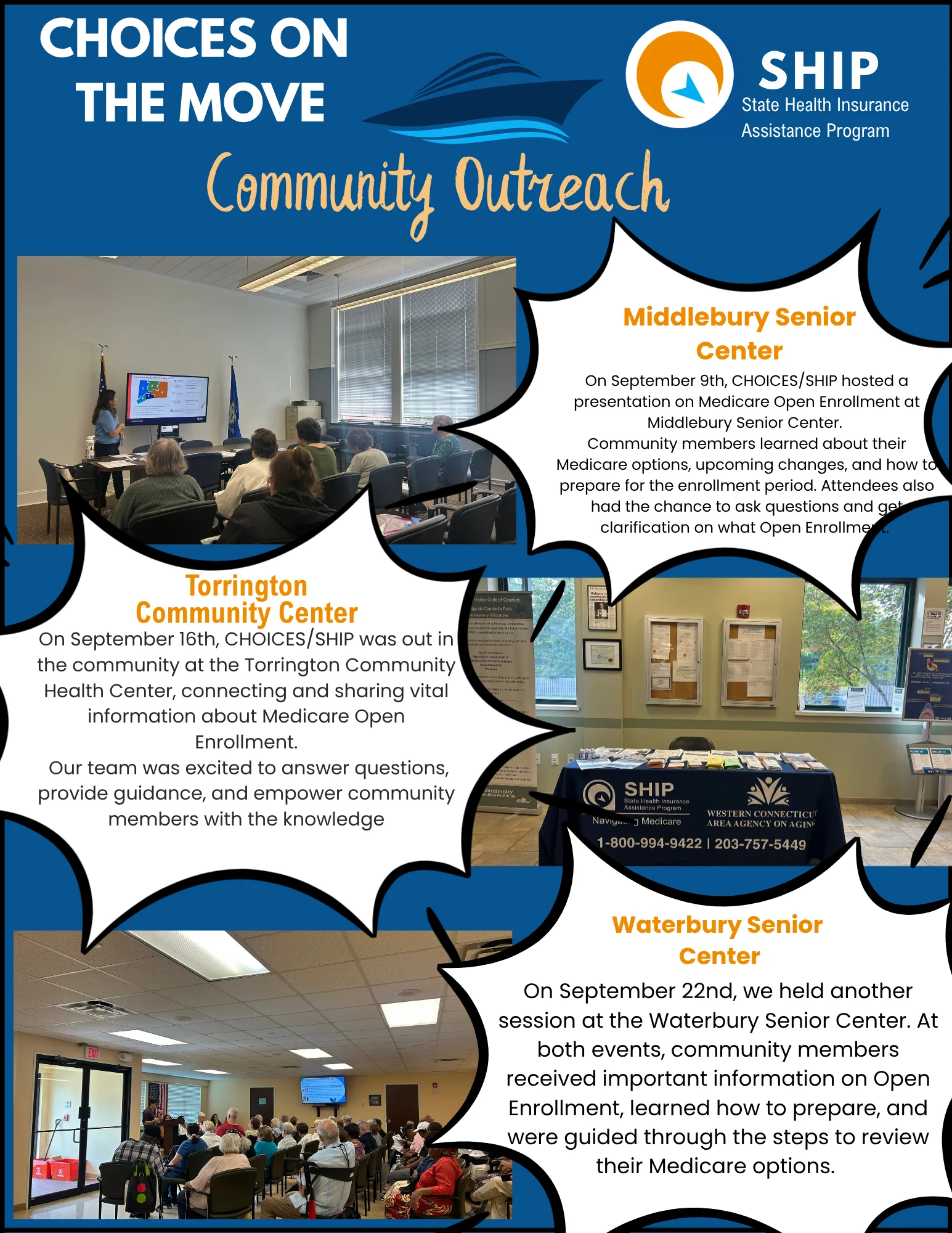 This September, our CHOICES/SHIP team visited senior centers across Middlebury, Torrington, and Waterbury to share helpful information about Medicare Open Enrollment. We’re grateful for the opportunity to connect, inform, and support our community.