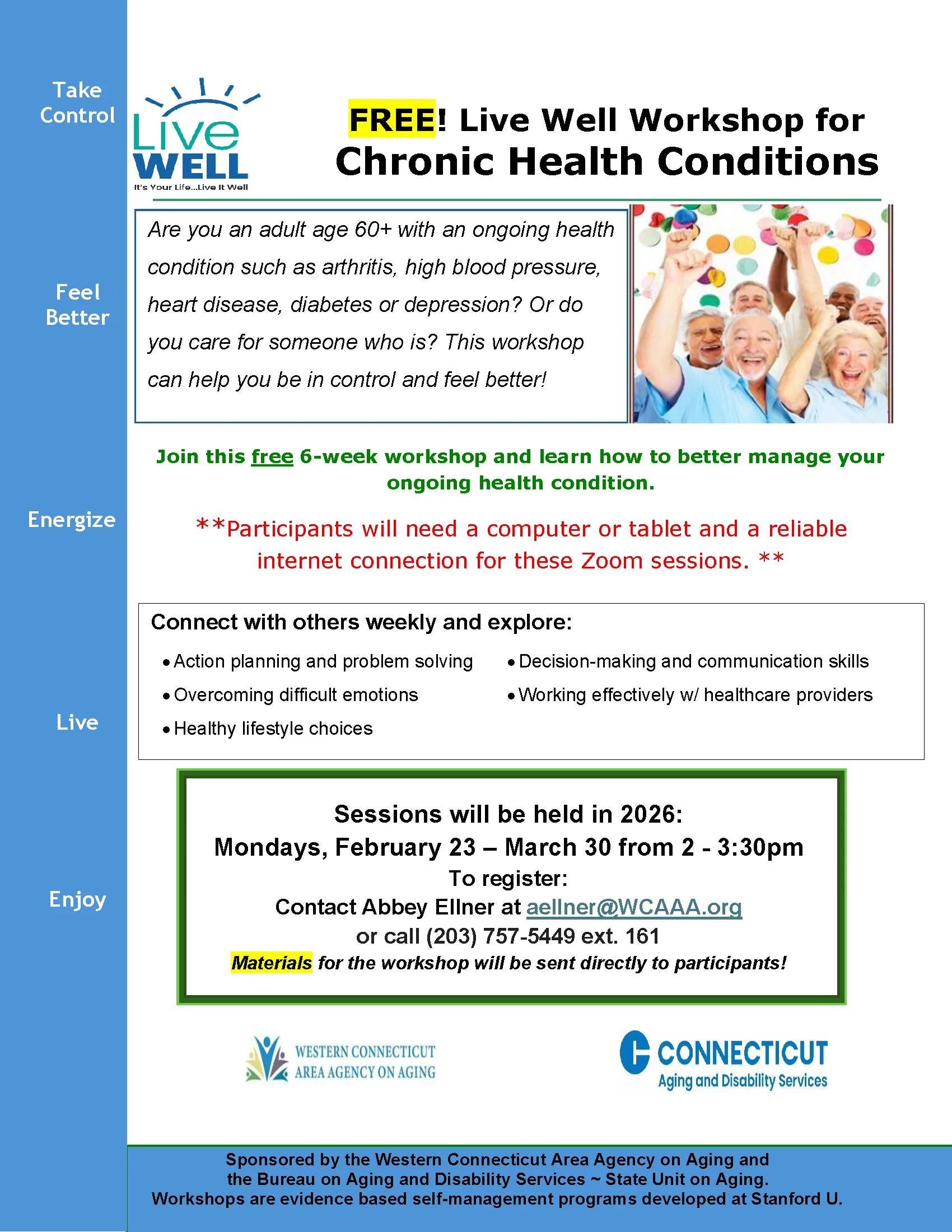 This free 7-week Zoom workshop is designed for adults age 60+ living with chronic health conditions such as arthritis, diabetes, heart disease, high blood pressure, or depression. Participants will learn practical tools to better manage their health, reduce stress, and feel more in control.