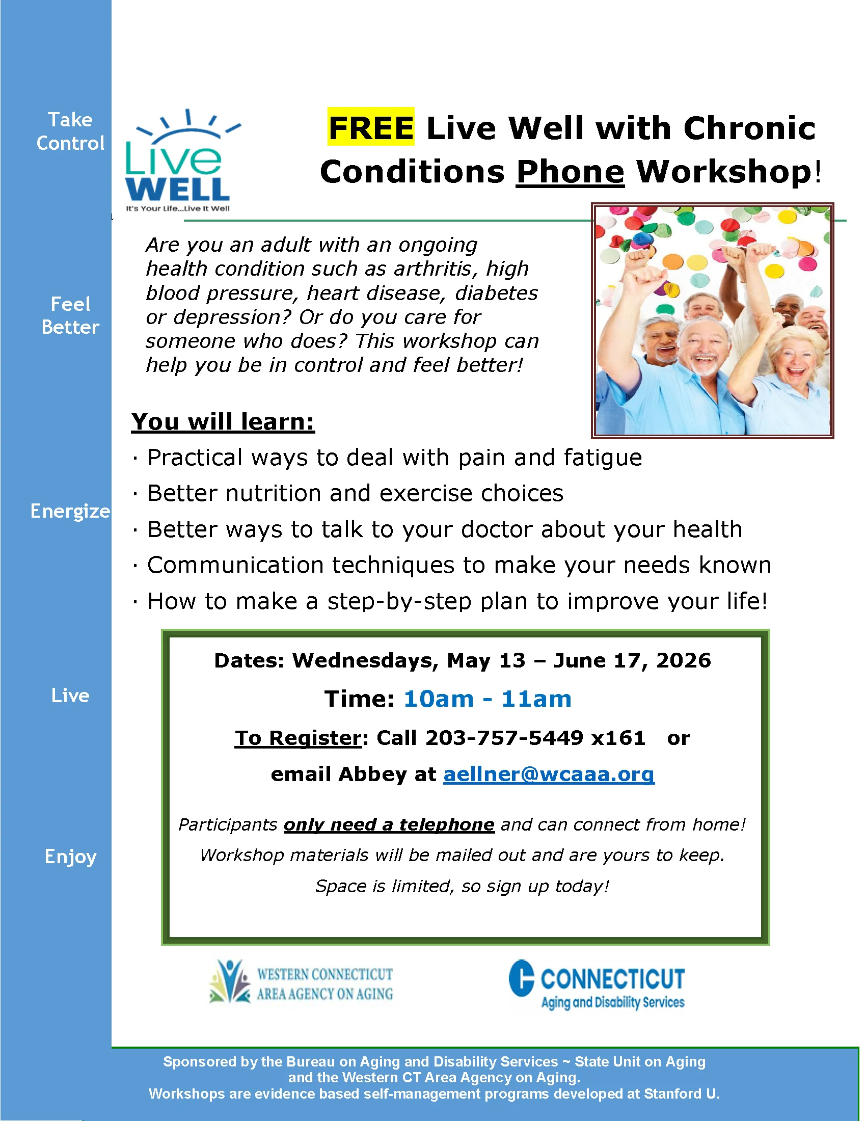 This free 7-week Zoom workshop is designed for adults age 60+ living with chronic health conditions such as arthritis, diabetes, heart disease, high blood pressure, or depression. Participants will learn practical tools to better manage their health, reduce stress, and feel more in control.